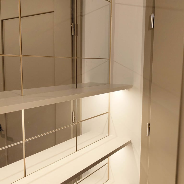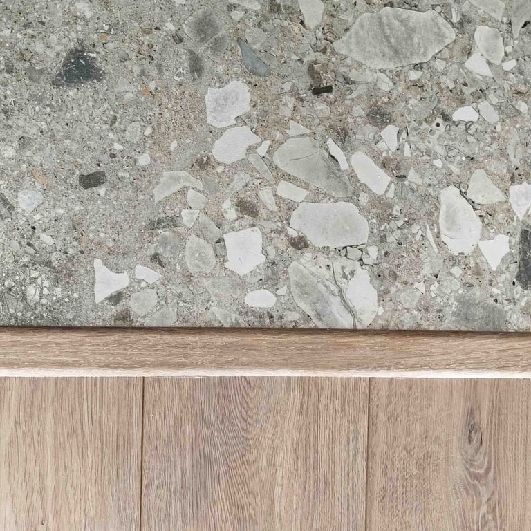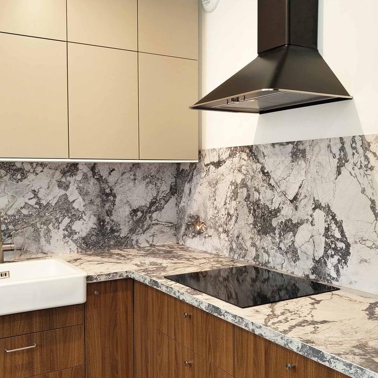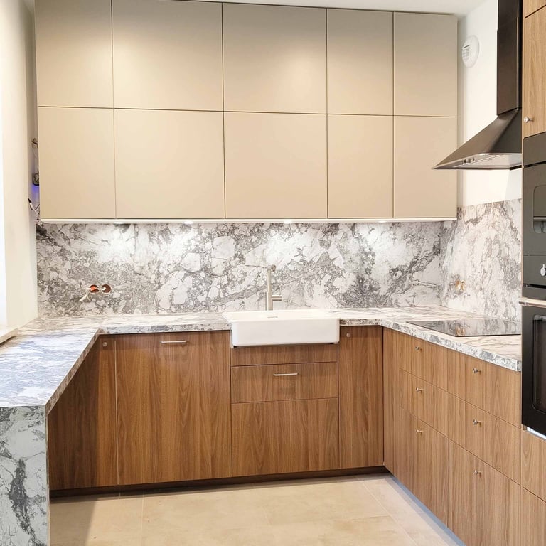 W przedpokoju płytki efekt "terrazzo alla veneziana" i lustra; w kuchni z kolei ciemne fronty i "marmurkowe" blaty